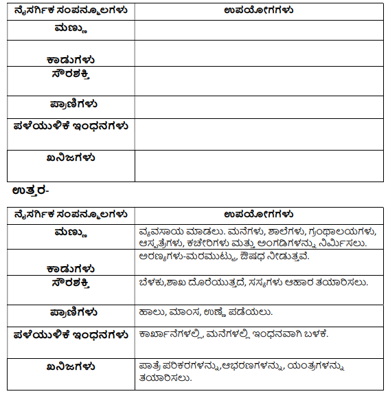 ಪಟ್ಟಿಯಲ್ಲಿ ಕೊಟ್ಟಿರುವ ನೈಸರ್ಗಿಕ ಸಂಪನ್ಮೂಲಗಳ ಉಪಯೋಗಗಳನ್ನು ಬರೆ.